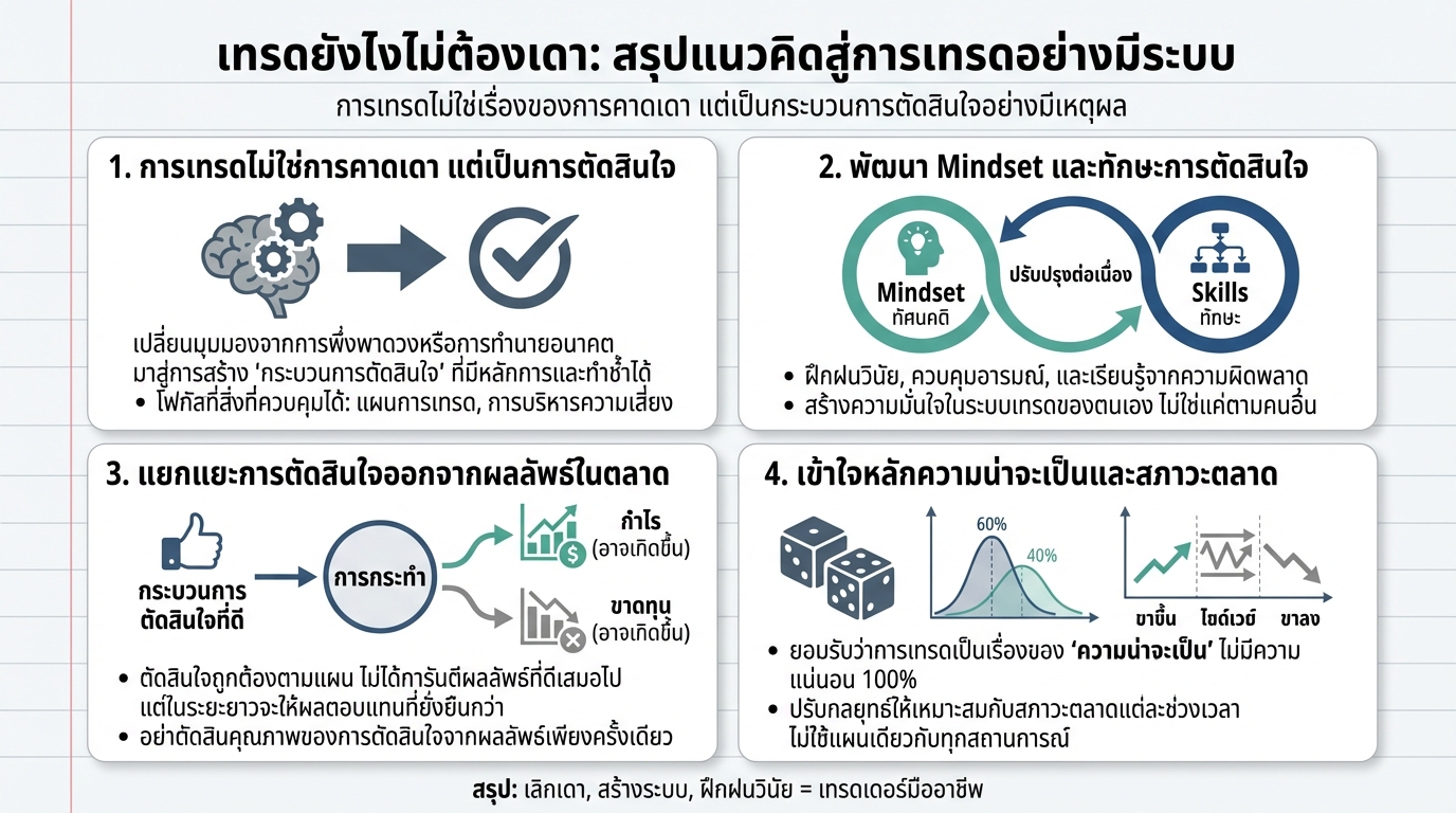 แทนที่จะพยายามคาดเดาตลาด เทรดเดอร์ควรให้ความสำคัญกับกระบวนการตัดสินใจที่ถูกต้อง ซึ่งรวมถึงการวิเคราะห์ข้อมูล การวางแผน และการบริหารความเสี่ยง