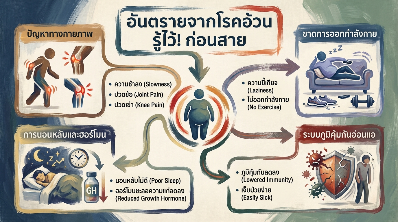 โรคอ้วนเป็นปัญหาที่ส่งผลกระทบต่อสุขภาพอย่างรอบด้าน เปรียบเสมือนบ่อเกิดของความเจ็บป่วยต่างๆ ที่อาจนำไปสู่ภาวะแทรกซ้อนร้ายแรง หากไม่ได้รับการดูแลอย่างเหมาะสม การทำความเข้าใจถึงอันตรายจากโรคอ้วนจึงเป็นสิ่งสำคัญ เพื่อให้เราสามารถตระหนักถึงความเสี่ยงและหาแนวทางป้องกันได้อย่างทันท่วงที บทความนี้จะพาคุณไปสำรวจถึงผลกระทบต่างๆ ที่เกิดจากโรคอ้วน ทั้งในด้านร่างกาย การนอนหลับ ระบบฮอร์โมน และระบบภูมิคุ้มกัน เพื่อให้คุณได้รู้เท่าทันและดูแลสุขภาพของตนเองได้อย่างมีประสิทธิภาพ