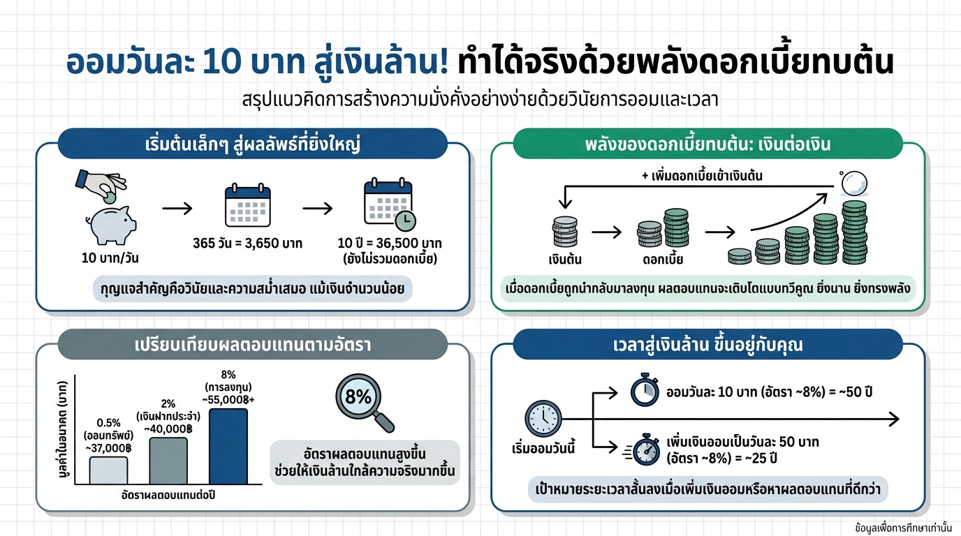 การออมวันละ 10 บาทอาจดูเหมือนเป็นจำนวนเงินที่น้อย แต่เมื่อรวมกับพลังของดอกเบี้ยทบต้น มันจะสามารถสร้างความเปลี่ยนแปลงที่ยิ่งใหญ่ได้ในระยะยาว