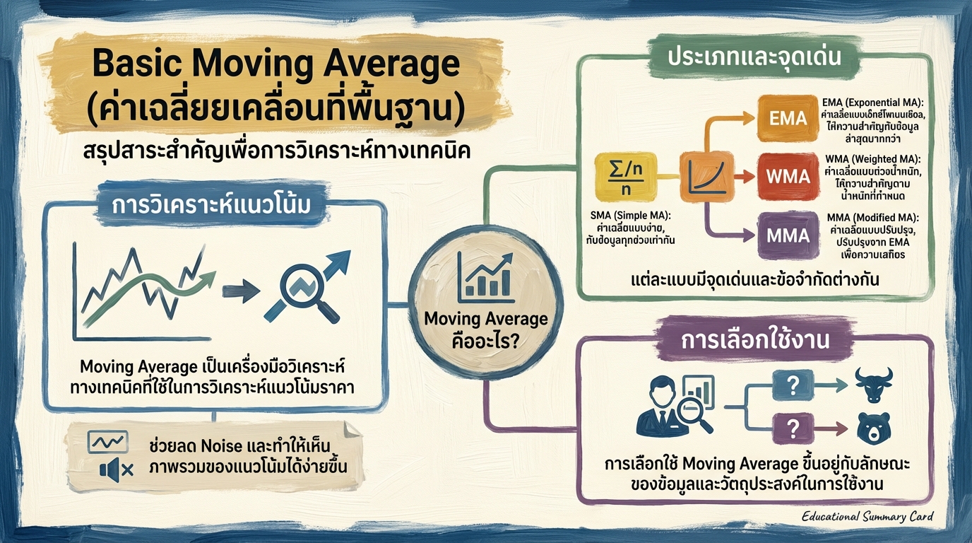 การวิเคราะห์ทางเทคนิค (Technical Analysis) เป็นเครื่องมือสำคัญที่นักลงทุนและนักเทรดใช้ในการประเมินแนวโน้มราคาและตัดสินใจซื้อขายสินทรัพย์ต่างๆ หนึ่งในเครื่องมือพื้นฐานและได้รับความนิยมอย่างแพร่หลายคือ Moving Average หรือค่าเฉลี่ยเคลื่อนที่ บทความนี้จะพาคุณไปทำความเข้าใจอย่างลึกซึ้งเกี่ยวกับ Basic Moving Average ตั้งแต่ความหมาย, ประเภท, วิธีการใช้งาน, ไปจนถึงกลยุทธ์การเทรดขั้นพื้นฐาน เพื่อให้คุณสามารถนำไปประยุกต์ใช้ในการเทรดได้อย่างมีประสิทธิภาพ