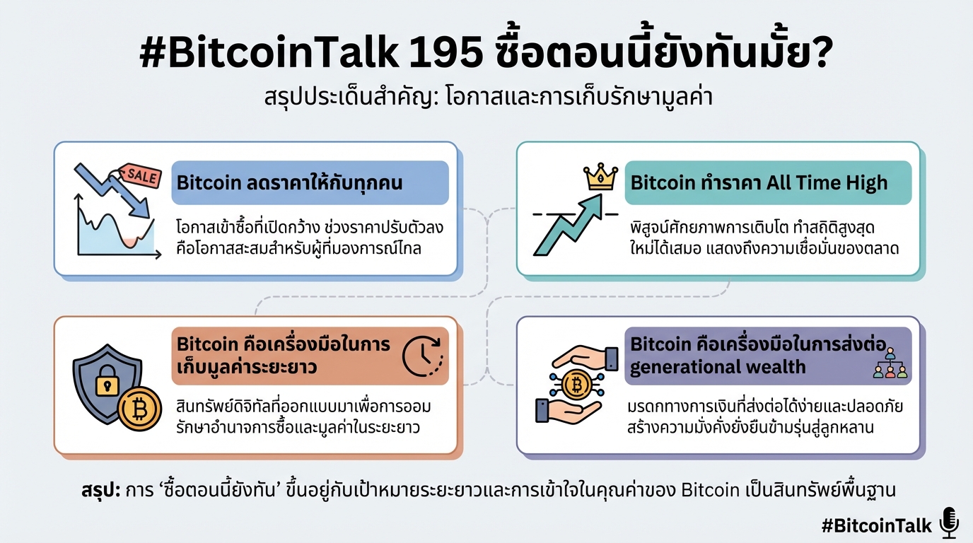 ยินดีต้อนรับสู่ #BitcoinTalk 195! วันนี้เราจะมาเจาะลึกประเด็นร้อนแรงที่หลายคนสงสัย: ซื้อ Bitcoin ตอนนี้ยังทันไหม? หลังจากที่ราคา Bitcoin พุ่งทะยานทำ All Time High อีกครั้ง คำถามนี้จึงเป็นที่สนใจของทั้งนักลงทุนหน้าเก่าและหน้าใหม่ บทความนี้จะพาคุณไปสำรวจทุกแง่มุมของ Bitcoin พร้อมคำแนะนำที่เป็นประโยชน์ เพื่อให้คุณตัดสินใจได้อย่างมั่นใจ