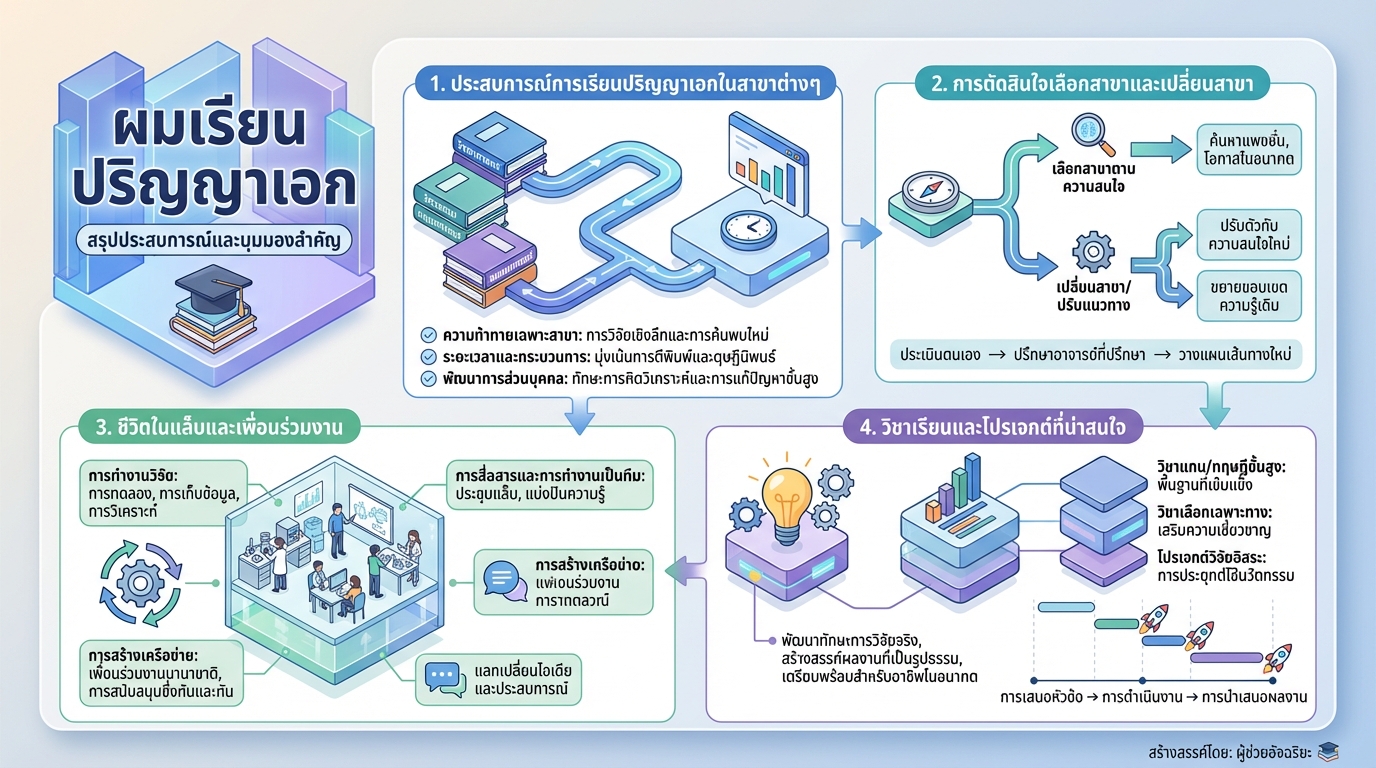 การเดินทางสู่ปริญญาเอกเป็นประสบการณ์ที่เต็มไปด้วยความท้าทาย ความสำเร็จ และบทเรียนชีวิตมากมาย บทความนี้จะพาคุณไปสำรวจเส้นทางของผมในการเรียนปริญญาเอก ตั้งแต่การเลือกสาขา การใช้ชีวิตในแล็บ วิชาเรียนที่น่าสนใจ ไปจนถึงการจัดการกับอุปสรรคต่างๆ ที่เข้ามาในชีวิต
