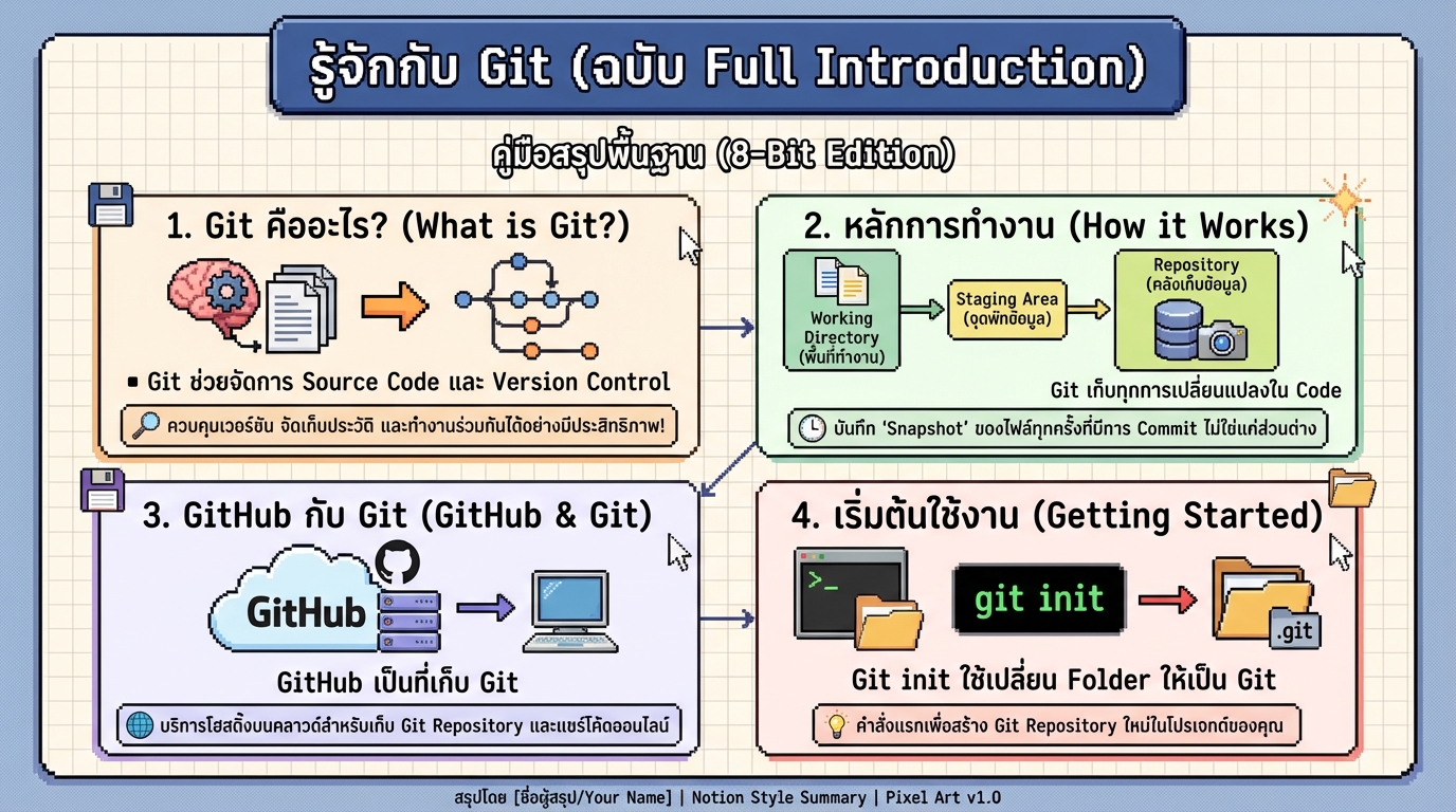 Git คือระบบควบคุมเวอร์ชัน (Version Control System) ที่ช่วยให้คุณติดตามการเปลี่ยนแปลงของโค้ดได้อย่างมีประสิทธิภาพ Git ช่วยให้คุณสามารถบันทึกการเปลี่ยนแปลงในแต่ละขั้นตอน สร้างเวอร์ชันต่างๆ และทำงานร่วมกับผู้อื่นได้อย่างง่ายดาย