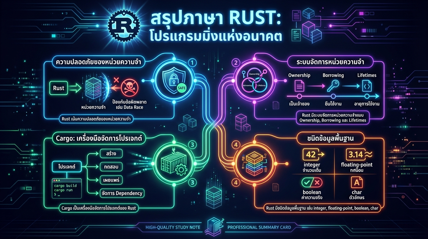 Rust เป็นภาษาโปรแกรมที่ได้รับความนิยมเพิ่มขึ้นอย่างรวดเร็วในช่วงไม่กี่ปีที่ผ่านมา ด้วยความโดดเด่นในเรื่องความปลอดภัยของหน่วยความจำ (Memory Safety) และประสิทธิภาพที่สูง ทำให้ Rust กลายเป็นตัวเลือกที่น่าสนใจสำหรับนักพัฒนาที่ต้องการสร้างซอฟต์แวร์ที่มีความน่าเชื่อถือและรวดเร็ว บทความนี้จะนำเสนอคู่มือฉบับสมบูรณ์เกี่ยวกับการเขียนโปรแกรมด้วย Rust ตั้งแต่พื้นฐานไปจนถึงแนวคิดขั้นสูง เพื่อให้คุณสามารถเริ่มต้นการเดินทางในโลกของ Rust ได้อย่างมั่นใจ