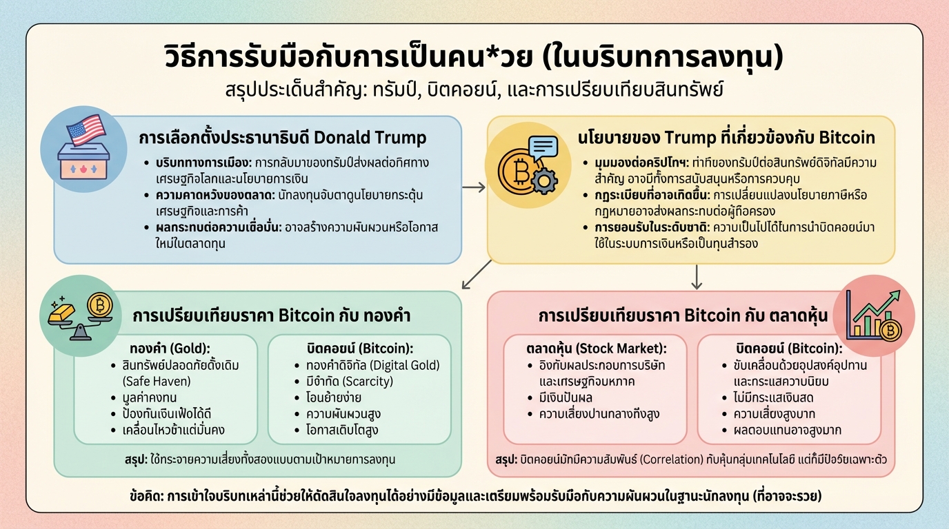 การเลือกตั้งประธานาธิบดี Donald Trump มีผลกระทบอย่างมากต่อตลาด Bitcoin นโยบายของ Trump ที่เน้นการปกป้องสิทธิในการถือครอง Bitcoin และส่งเสริมเสรีภาพทางการเงิน อาจเป็นปัจจัยบวกที่สำคัญต่อราคา Bitcoin